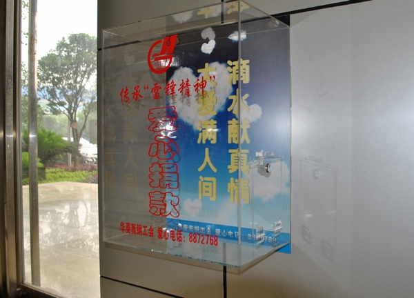2012年6月13日,標(biāo)有“滴水獻(xiàn)真情、大愛滿人間”圖案,“傳承雷鋒精神”“愛心捐款”箱正式亮相衡鋼。是日上午,工作人員在公司3號(hào)門及公司營(yíng)銷大樓各安裝好了一個(gè)固定式“愛心捐款”箱。據(jù)悉,在工礦企業(yè)內(nèi)部設(shè)立此類愛心捐款箱,在全市尚屬首例。