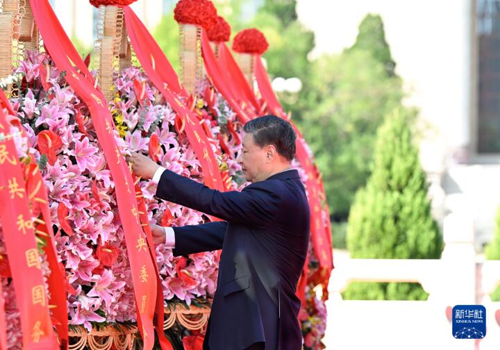 9月30日上午,黨和國家領(lǐng)導(dǎo)人習(xí)近平、李強、趙樂際、王滬寧、蔡奇、丁薛祥、李希、韓正等來到北京天安門廣場,出席烈士紀(jì)念日向人民英雄敬獻(xiàn)花籃儀式。這是習(xí)近平整理花籃上的緞帶。新華社記者 殷博古 攝