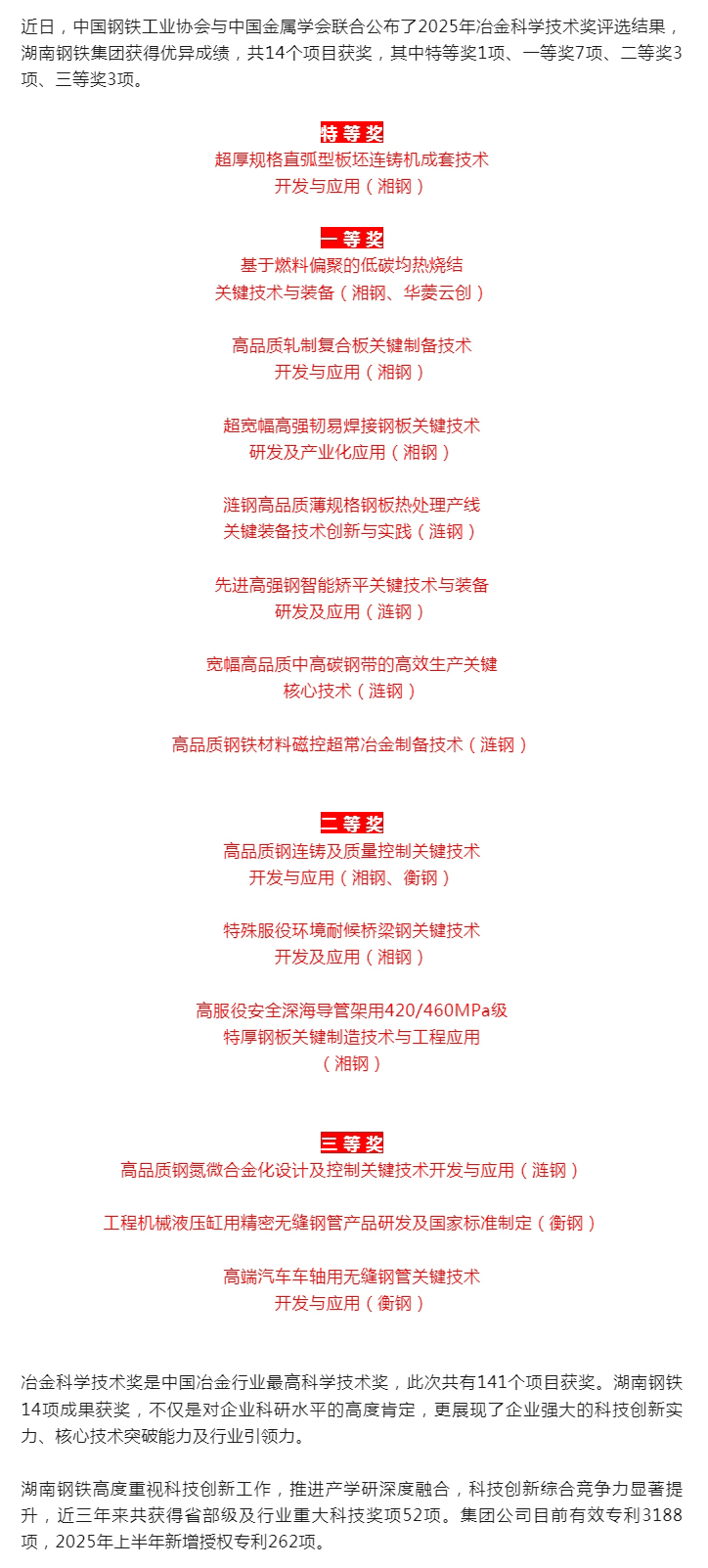 湖南鋼鐵新動能丨14項獲獎成果閃耀2025年冶金科學(xué)技術(shù)獎榜單